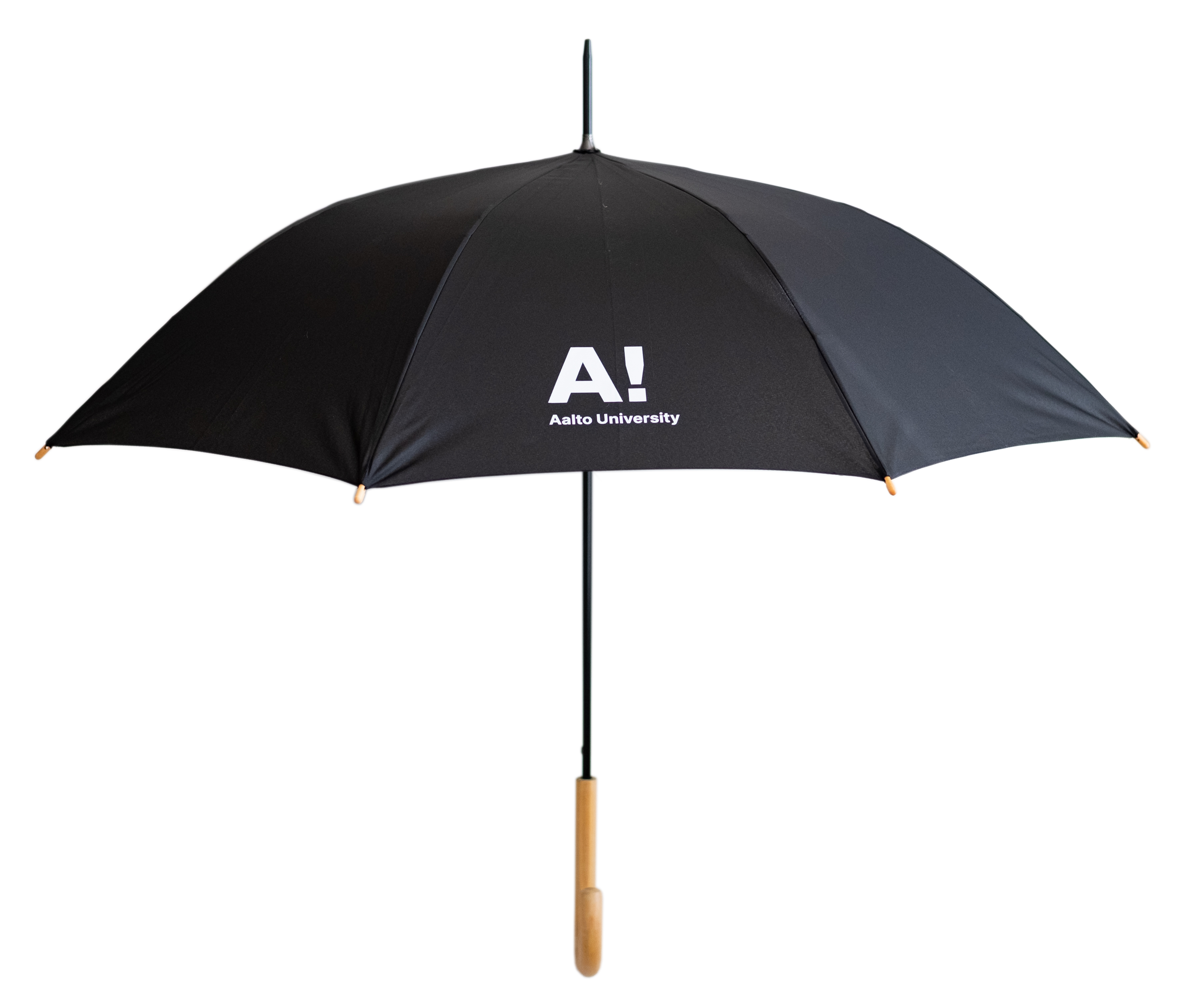 Musta sateenvarjo, jossa Aalto-yliopiston logo.